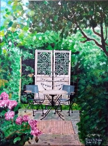 Tuin Je mist de oude kleurige zonnige tuin na een verhuizing. Oplossing: Laat een schilderij van je oude tuin maken, hang het boven de bank en geniet voortaan iedere dag!